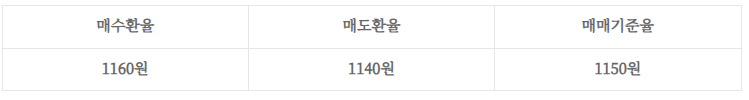 - (매수환율 + 매도 환율) / 2 = (1160원 + 1140원) /2 = 1150원
