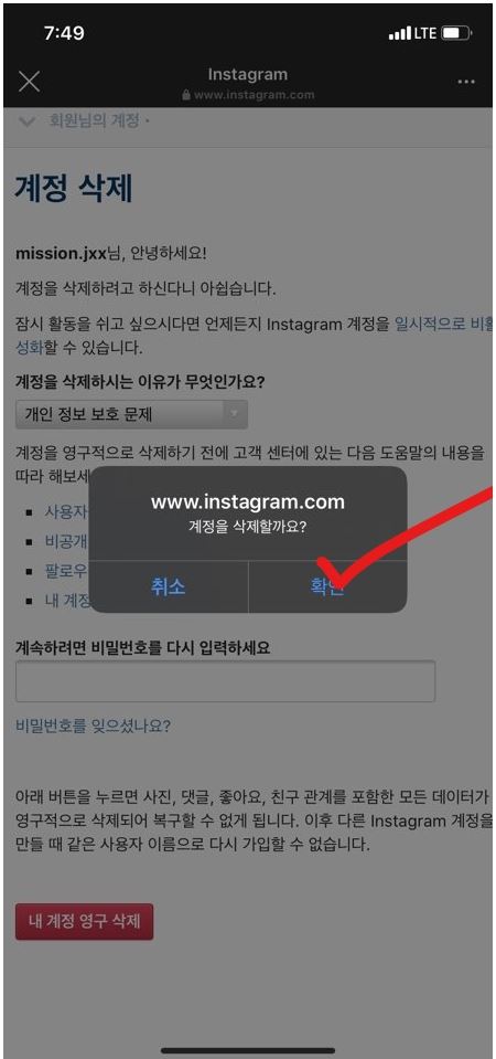 그러면 확인 창이 뜨는데요. 그냥 확인 눌러주면 됩니다. 이렇게 인스타그램 계정을 탈퇴하게 됩니다.