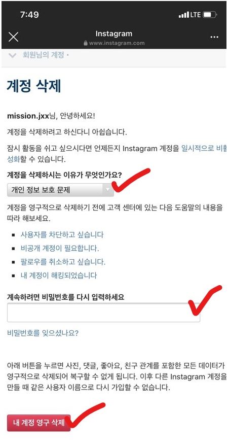 사유를 정하고 비밀번호를 적어줍니다. 그리고 아래 내 계정 영구 삭제를 눌러줍니다.