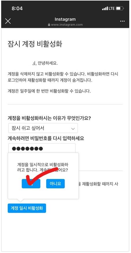 사유와 비밀번호를 적고 계정 임시 비활성화를 클릭하면 확인창이 하나 나오는데요! 저기서 예를 눌러주면 바로 비활성화가 됩니다.