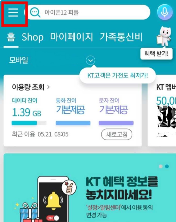 1. 휴대폰에서 '마이 케이티' 어플을 다운받아 로그인한 후 좌측 상단에 메뉴(≡)를 클릭합니다.