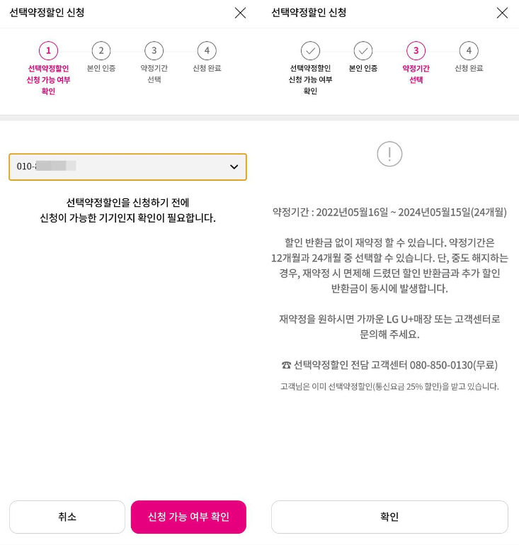 4. 본인의 전화번호를 선택하고 신청가능 여부확인을 누릅니다. 12개월과 24개월 중 본인에게 알맞는 약정기간을 설정하고 [확인] 버튼을 클릭해 마무리합니다.