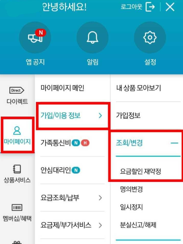 2. 좌측의 [마이페이지] 메뉴 클릭, [가입/이용정보] 클릭, [조회/변경] 탭을 클릭, [요금할인 재약정]을 클릭하여 접속해줍니다.