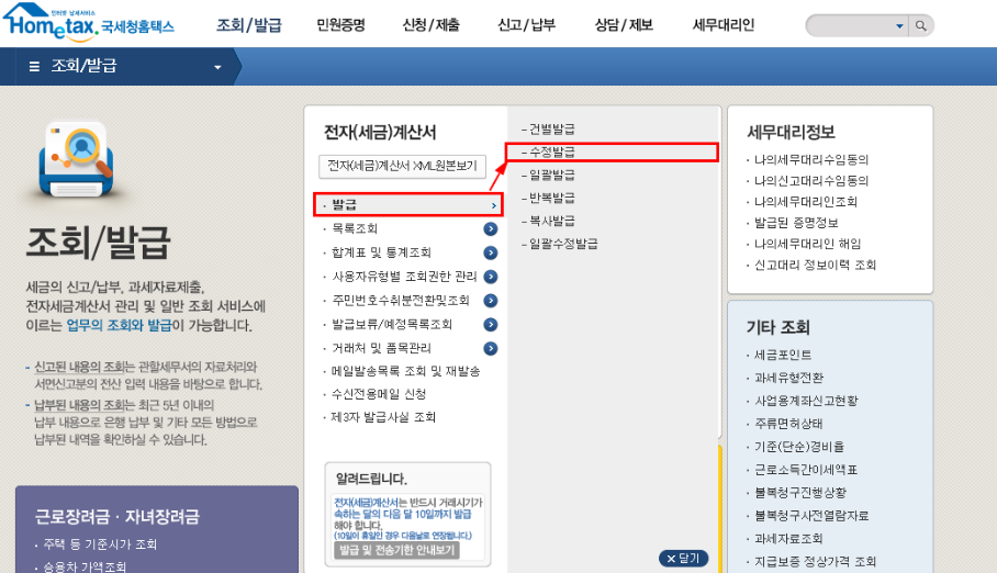 수정세금계산서를 발급하시려면 홈택스 사이트에서 하실 수 있습니다. 홈택스 사이트 접속은 아래 링크를 참고하세요.