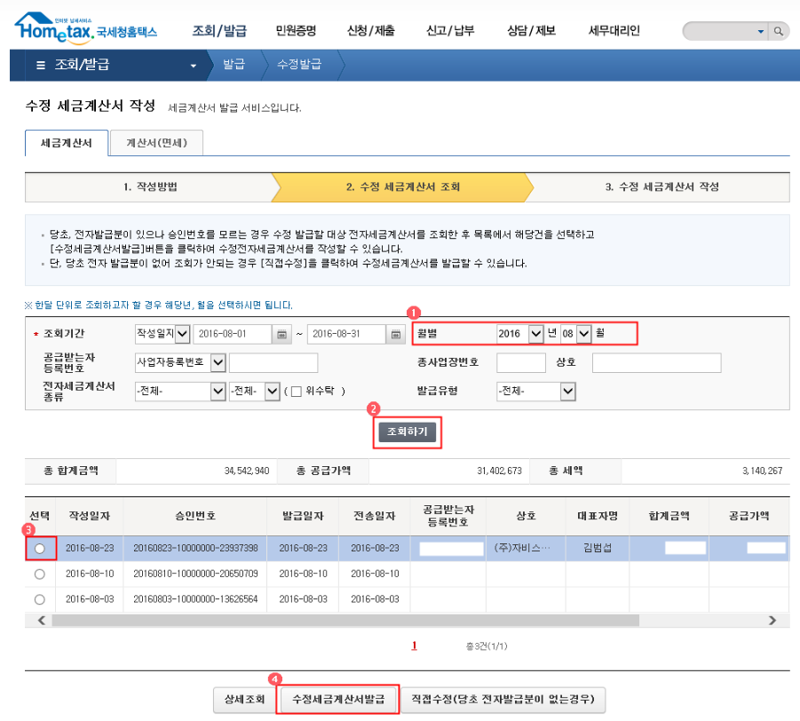 4. 수정세금계산서를 발급할 내역을 선택한 후, [수정세금계산서 발급] 버튼을 클릭합니다.