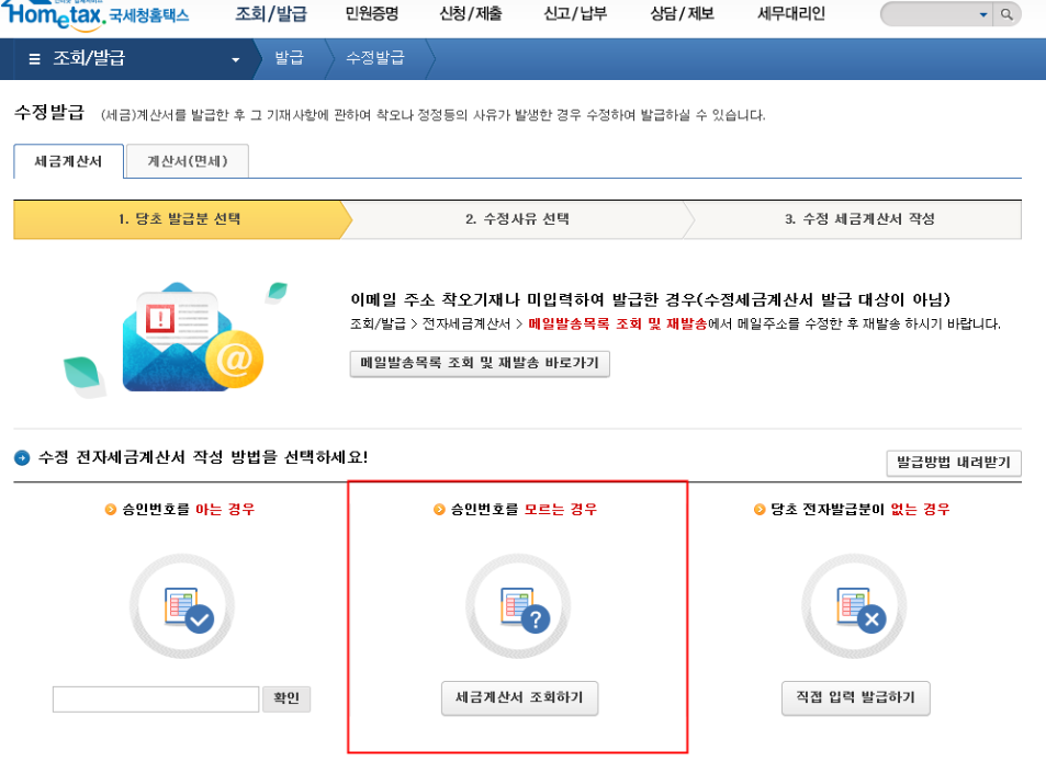 수정세금계산서를 발급하시려면 홈택스 사이트에서 하실 수 있습니다. 홈택스 사이트 접속은 아래 링크를 참고하세요.
