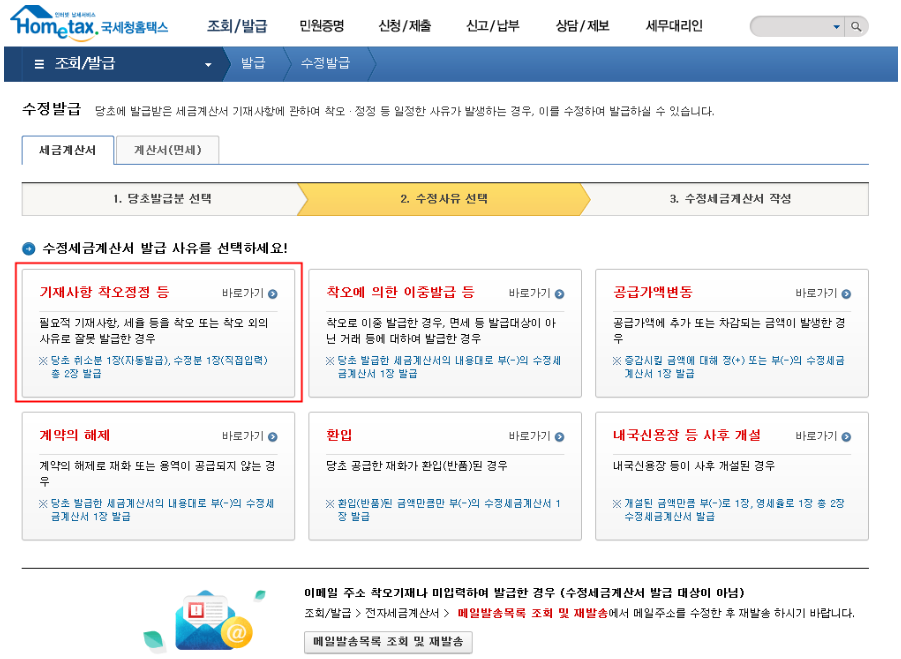 5. 수정세금계산서 발급 사유 6가지 중 해당하시는 사유를 선택합니다.