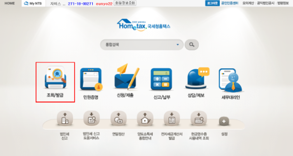 1. 홈택스에 접속하셨으면 공인인증서 로그인을 하신 후, [조회/발급] 메뉴를 클릭합니다.
