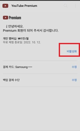유튜브 프리미엄 비활성화 없음 입니다. 감사합니다.