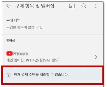 가장 크게 오류가 발생하는 경우가 아래와 같이 아이폰(iOS)의 구매 항목 및 멤버십 화면에서 나타나더라도 “현재 결제 수단을 처리할 수 없습니다.”라고 오류가 나타나는 경우 입니다.
