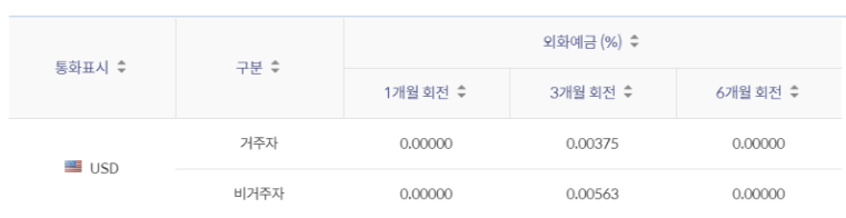 1개월마다 금리가 바뀝니다. 국민은행 홈페이지, 혹은 영업점에 고시된 외화예금 금리가 있습니다. 현재 6개월 기준 0.06963%입니다.
