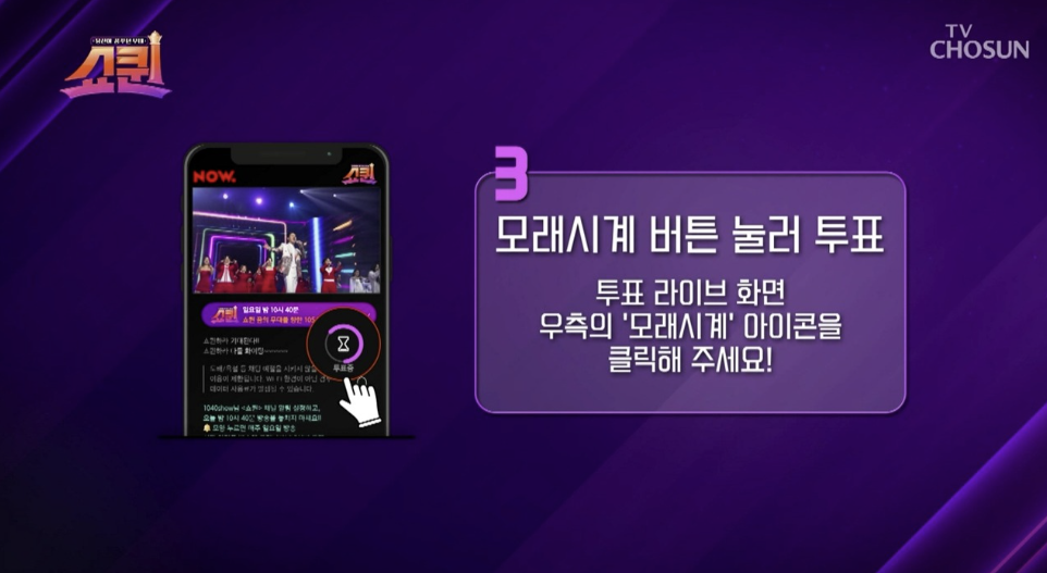 3. 투표 라이브 화면 우측의 '모래시계' 아이콘을 클릭하면 투표하실 수 있습니다.