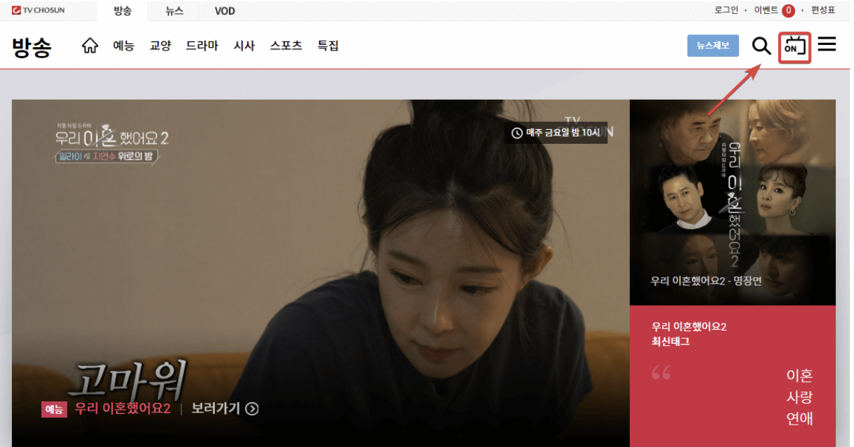 2) 우측 상단의 on TV 모양을 클릭합니다. tv조선3 온에어를 시청하실 수 있습니다.