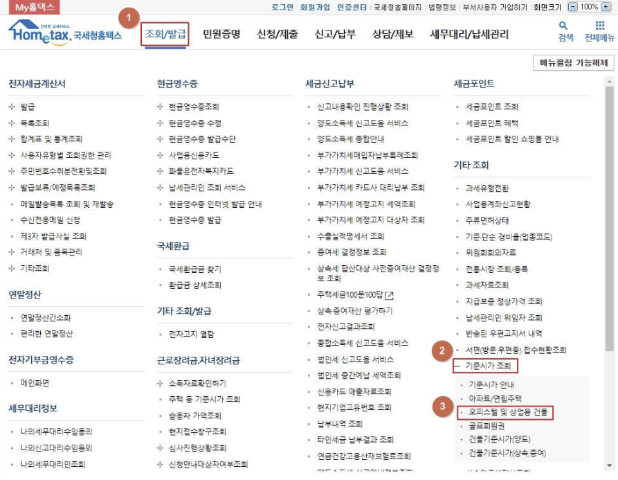 2. 홈택스 상가 건물 공시지가 조회를 하려면 홈택스 사이트 중 상가 공시가격 조회 및 열람을 위한 페이지는 상단 메뉴의 [조회/발급] 탭 클릭, [기준시가 조회] 메뉴 클릭, [오피스텔 및 상업용 건물] 메뉴를 클릭하시면 상가 공시가격 조회 및 열람 페이지에 접속할 수 있습니다.