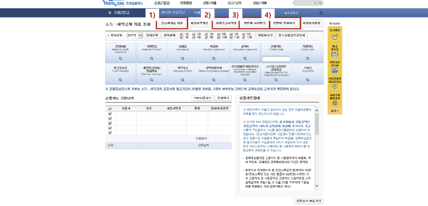 건강보험, 국민연금,보험료,의료비,교육비,신용카드, 직불카드 등을 하나씩 누르면 상세 내역이 열립니다.