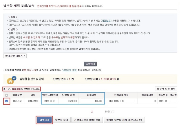 3. 납부세액 입력 후, 납부하기 버튼을 클릭합니다.