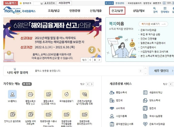 1. 국세청 홈택스 사이트에 로그인하고, 신고/납부 메뉴를 클릭합니다.