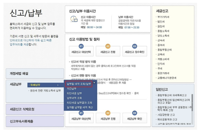 2. 세금납부 클릭, 국세납부 클릭, 납부할 세액 조회/납부 메뉴를 클릭합니다.