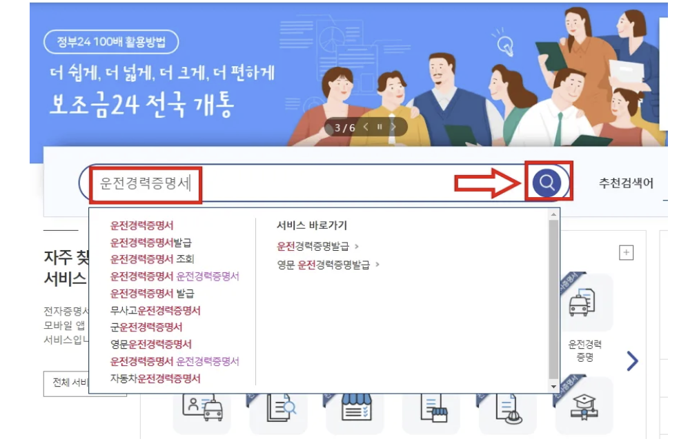 1.인터넷 정부 24 사이트를 접속후 “운전경력증명서”를 검색합니다.