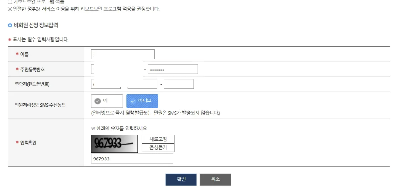 3.비회원으로 접속한후 아래와 같이 인적사항을 기록하고 확인합니다.