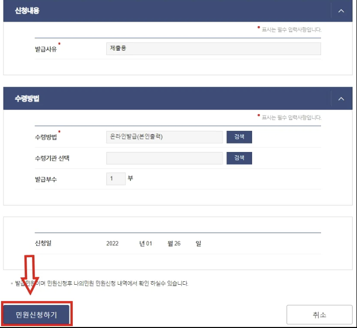 5.발급사유, 수령방법(본인출력)을 확인하고 민원을 신청합니다.