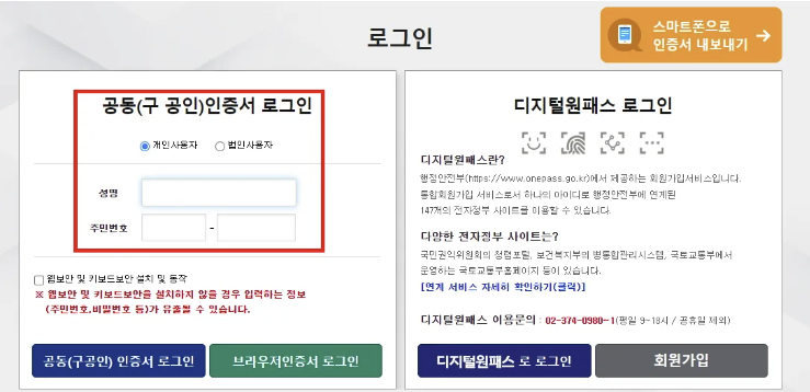 4.본인이 편리한 방법대로 공인인증서 로그인을 합니다.