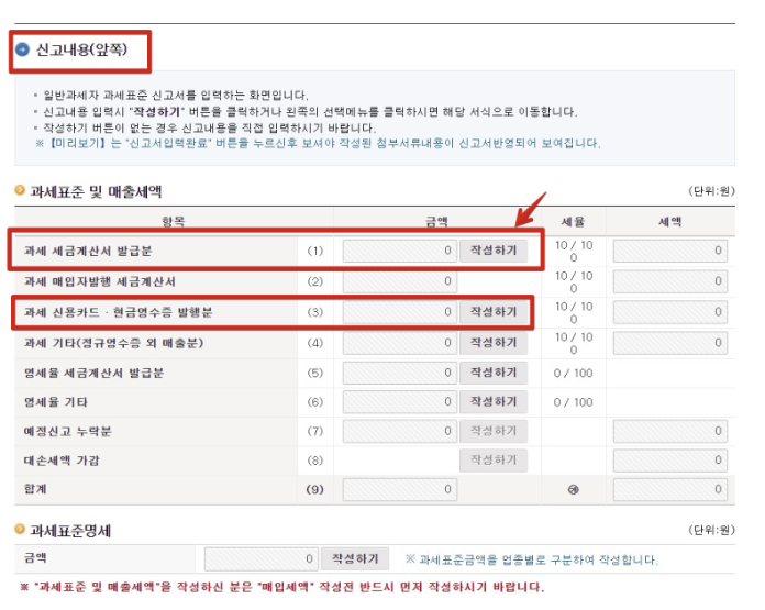 6. 과세 세금계산서 발급분을 작성해야합니다. 만약 신용카드 또는 현금영수증 발행분이 있다면 아래쪽도 작성하기를 눌러서 작성해주시면 됩니다.