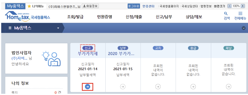 3. 상단의 해당하는 신고유형(부가가치세/원천세/법인세 중 하나)에 부합하는 탭을 클릭합니다.