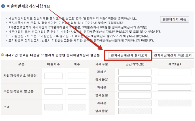 7. 과세 세금계산서 매출 내역을 입력합니다. 이젠 전자세금계산서로 돼 있어서 오른쪽에 있는 전자세금계산서 불러오기 버튼을 클릭하면, 전반기에 발행한 매출 전자세금계산서를 모조리 불러와서 간단하게 입력할 수 있습니다.