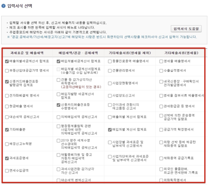 4. 입력서식을 선택해야 합니다. 이 부분은 사업자마다 체크하는 부분이 다를 수 있으므로 자신의 사업장에 해당하는 부분을 잘 살펴보고 체크하실 것을 추천드립니다.