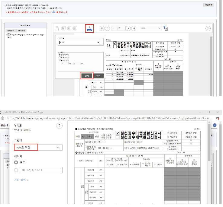 5. 신고서미리보기 팝업창에서 인쇄 모양 클릭 후 > [인쇄] > [PDF로 저장]을 순서대로 클릭하시면 신고서를 발급하실 수 있습니다.