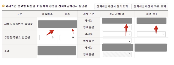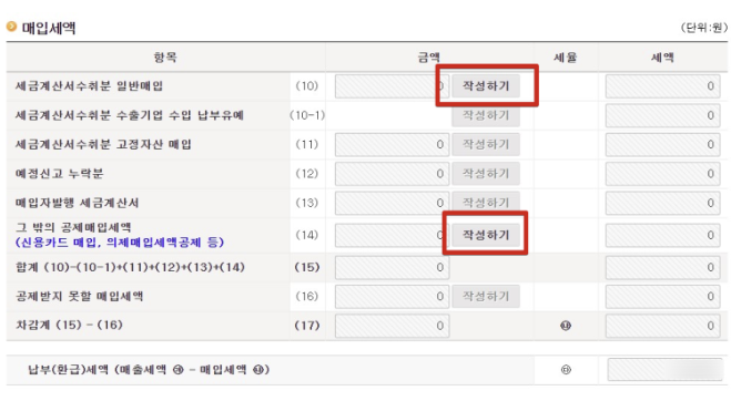 마지막으로 매입세액을 입력합니다. 세금계산서 수취분 일반매입부터 입력하면 되며, 더불어 사업자 신용카드로 매입한 결과는 14번 항목에 있으니 여기도 입력해줘야 합니다.