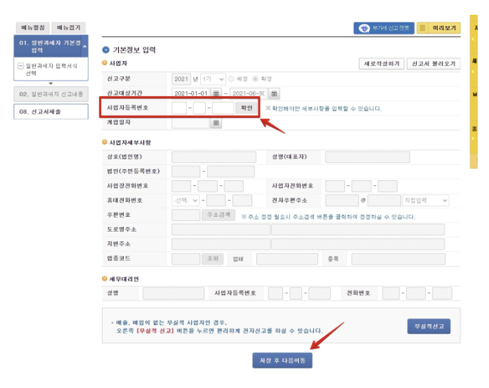 3. 아래와 같은 화면이 나오면 기본정보를 입력합니다. 여기에서 사업자등록번호를 입력한 후 확인 버튼을 누르면 사업자세부사항이 나타나고 이 사항을 확인한 후 다음으로 이동하실 수 있습니다.