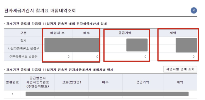 8. 매입내역도 마찬가지로 불러오기를 통해 매입한 내역을 찾아서 입력합니다. 전자세금계산서 발급분의 경우 자동으로 국세청 홈택스에 등록돼 있기 때문에 번거롭게 종이로 출력하거나 할 필요없이 이 자리에서 바로 체크하여 금액을 계산할 수 있습니다.