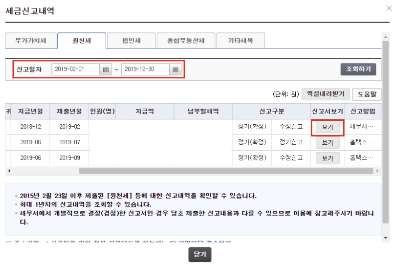 4. 조회 희망하는 신고일자를 클릭 > 신고서 보기 중 [보기] 버튼을 클릭합니다.