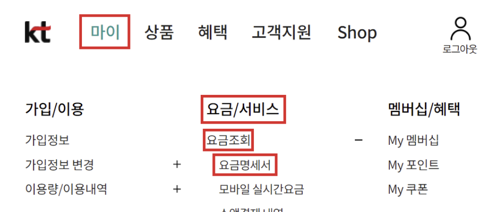 2. 마이메뉴에서 요금명세서 메뉴로 진입하시면 요금정보를 찾을 수 있고, 요금정보에 위약금 정보가 나와있습니다.