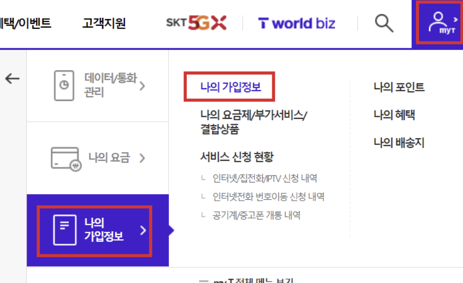 2. MyT메뉴에서 나의 가입정보로 진입합니다.