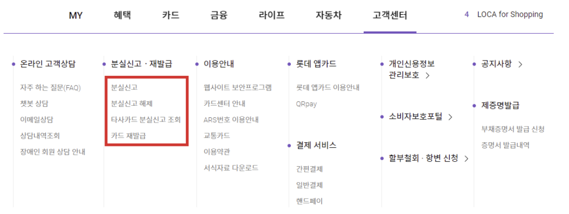 3. 해당 메뉴를 선택하면 온라인 고객상담, 분실신고, 이용안내, 롯데 앱카드, 결제 서비스 등의 메뉴가 나옵니다. [분실신고] 메뉴를 클릭합니다.
