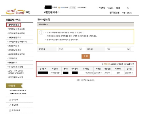 4. 우측에 조회 버튼을 클릭하면 증서번호/보험종류/계약자/피보험자/주보험금/계약일/최종납월/계약상태/만기일 등 여러 정보를 조회하실 수 있습니다.