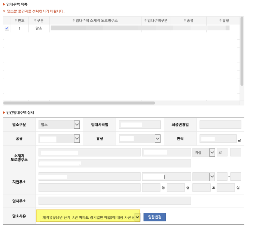5. 말소할 주택의 정보를 확인 후 선택하고 말소 사유를 선택합니다. 폐지유형주택을 말소할 경우 사유는 [2번]을 선택하시면 됩니다.