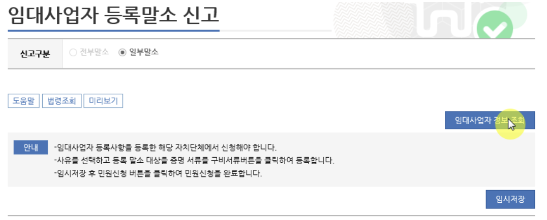 3. 전부말소 또는 일부말소 중 하나를 선택하고 [임대사업자 정보 조회]를 클릭합니다.