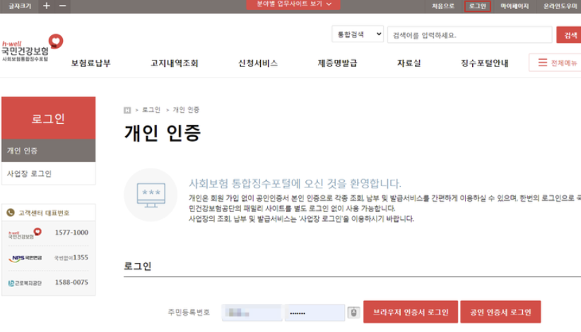 1. 국민건강보험 공단 사회보험통합징수포털 사이트에 접속합니다. 하단 링크를 접속하시면 건강보험공단 사이트에 바로 접속하실 수 있습니다.