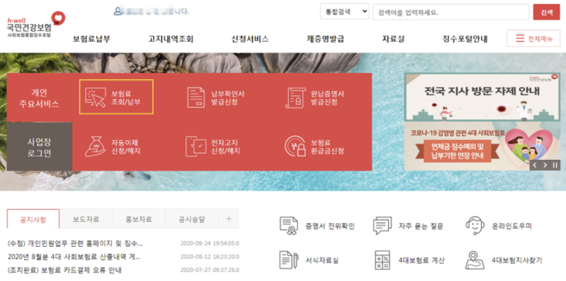 3. 상단의 [보험료 조회/ 납부] 메뉴를 클릭합니다.