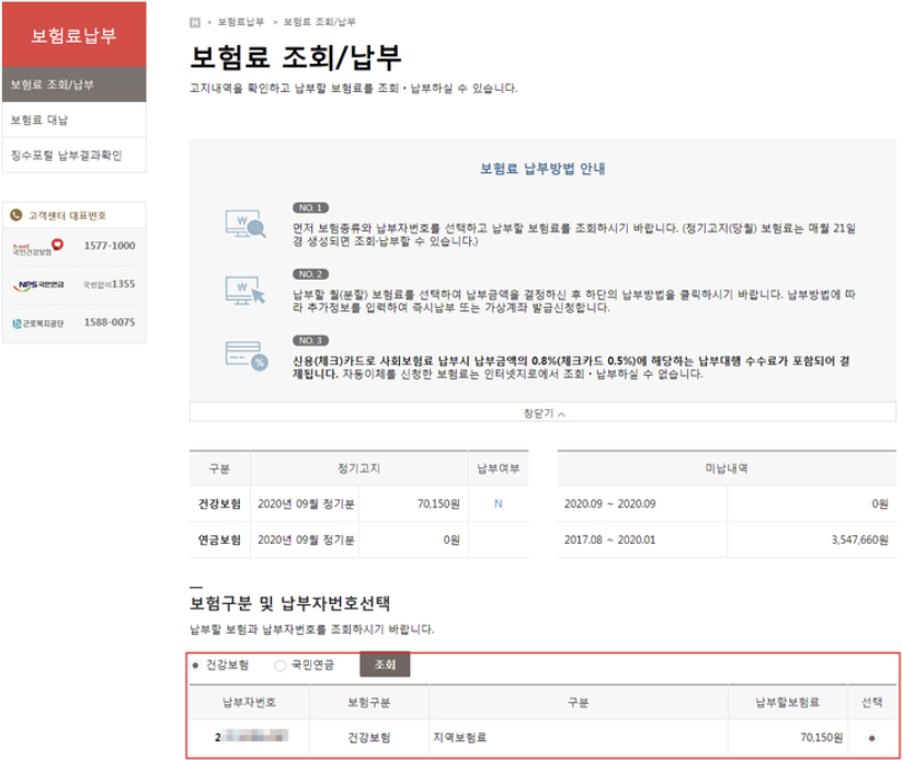 3. 상단의 [보험료 조회/ 납부] 메뉴를 클릭합니다. 건강, 국민연금 조회를 하여 지역, 개인사업자, 사업자 대표 등의 납부할 미납 보험료 조회를 하실 수 있습니다.