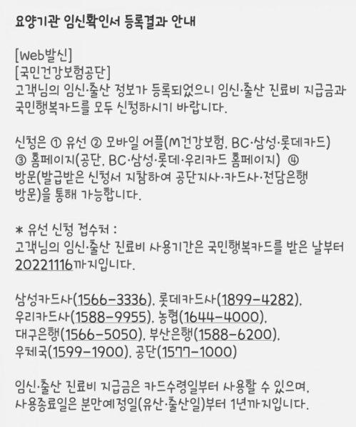 임신 확인 등록 신청을 한 날 바로 국민건강보험공단에서 임신확인서 등록이 완료되었다는 문자도 옵니다.