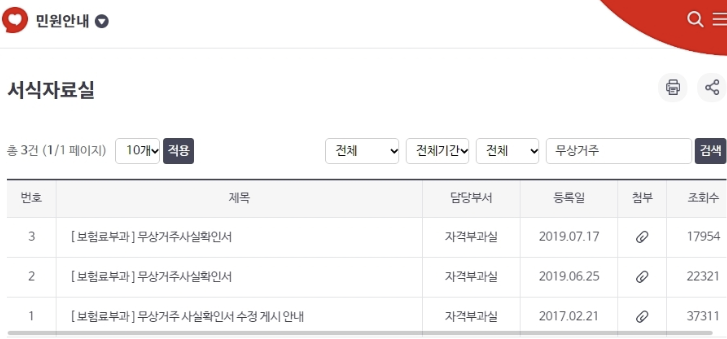 3. 그럼 무상거주사실확인서 게시물이 검색됩니다.