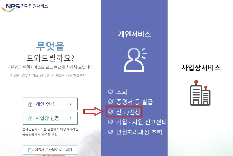 3. [개인서비스] 클릭, [신고/신청] 메뉴를 순서대로 클릭합니다.