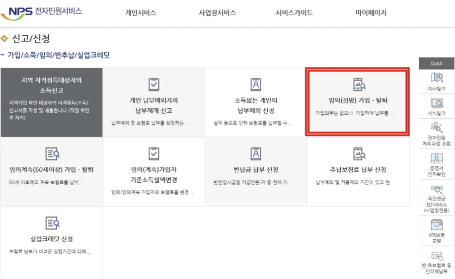 4.[임의가입 및 탈퇴] 메뉴를 클릭하시면 정상적으로 국민연금 임의가입이 가능합니다.