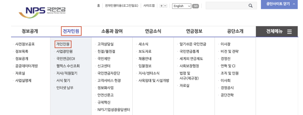 1. 국민연금공단 홈페이지 접속 후 [전자민원] > [개인 민원] 을 선택합니다. 하단 링크를 클릭하시면 국민연금공단 홈페이지에 접속이 가능합니다.
