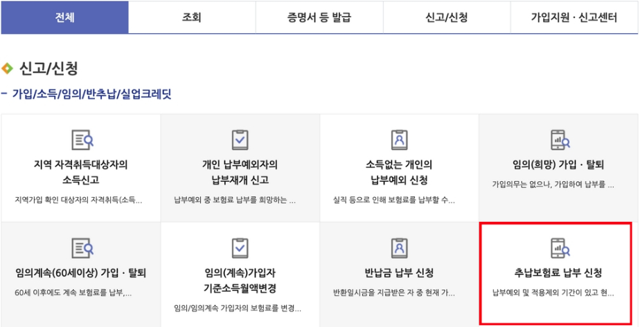 3. 로그인 후 개인 서비스에서 [신고/신청] 카테고리 이동 후 [추가 보험료 납부 신청]을 선택합니다.